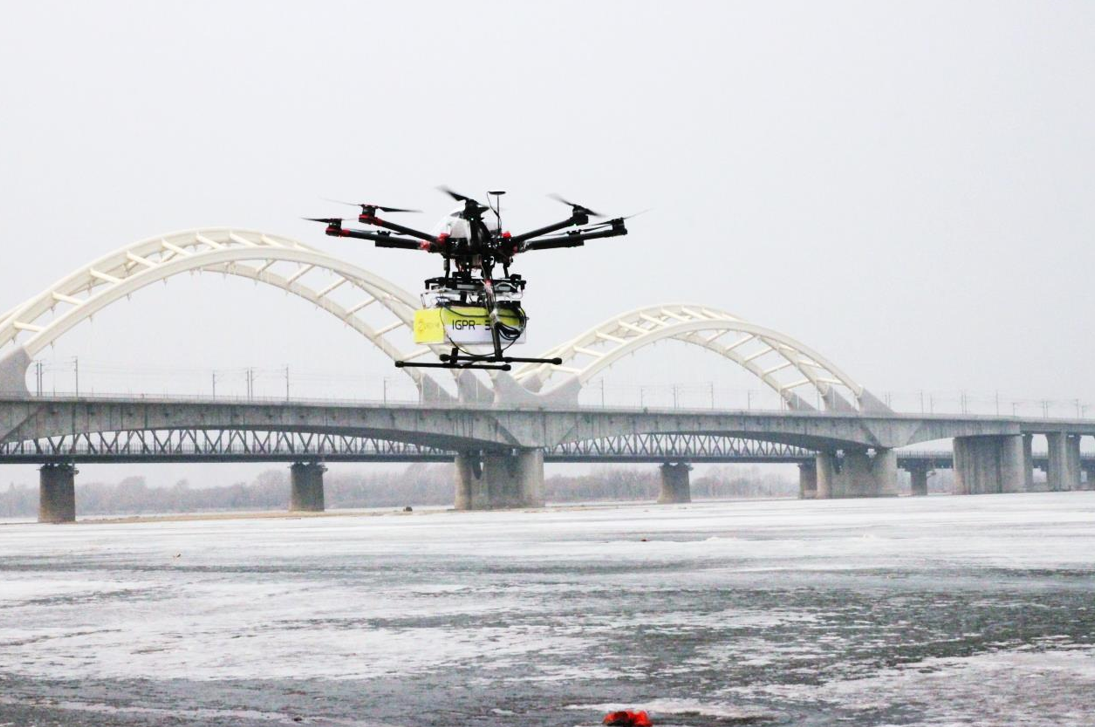 大連中睿科技發(fā)展有限公司歷時一年研發(fā)的IGPR-30無人機飛航測冰雷達,2016年初在松花江哈爾濱江段試驗成功,獲得了清晰準確的連續(xù)冰層雷達圖像。飛航測冰現(xiàn)場,系統(tǒng)飛行姿態(tài)穩(wěn)定,雷達探測成像清晰,操控靈敏,可以10-15m/s速度快速連續(xù)施測,可實時獲取高精度的河流冰層連續(xù)厚度數(shù)據(jù)。IGPR-30無人機飛航測冰雷達集成了RTK精確定位系統(tǒng),可準確測量記錄飛航測線軌跡,并與GIS地圖融合。IGPR-30無人機飛航測冰雷達是河流冰情觀測的創(chuàng)新性技術(shù)設(shè)備,為河流冰情快速精準測量和河流凌汛應(yīng)急探測提供了先進的高效率的技術(shù)手段。